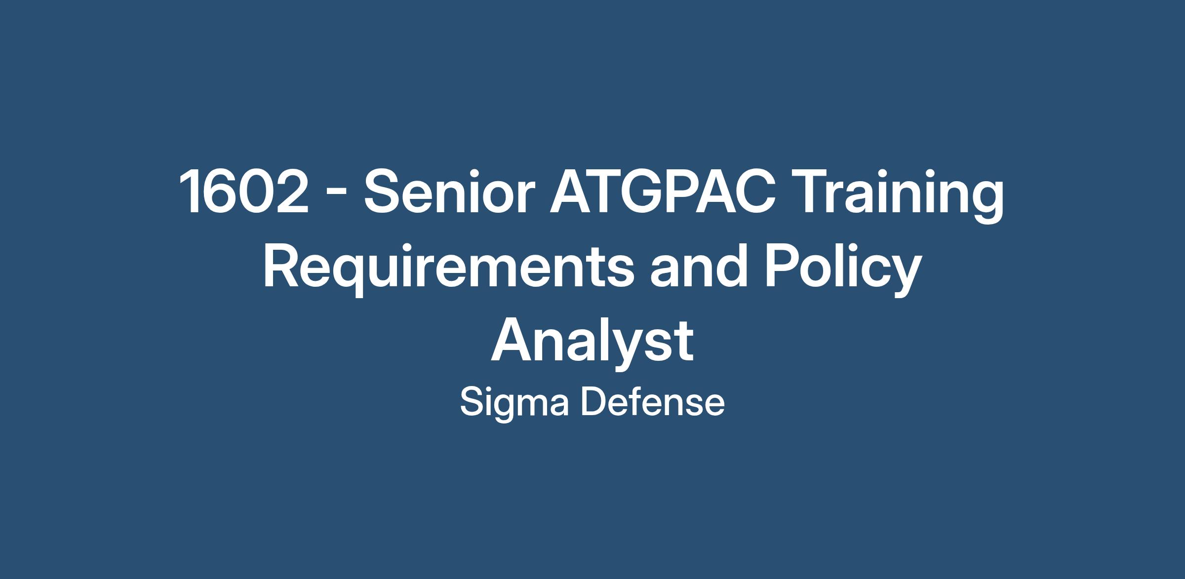 DescriptionSigma Defense is seeking a Senior ATGPAC Training Requirements and Policy Analyst to join our team at San Diego NB, CA.
