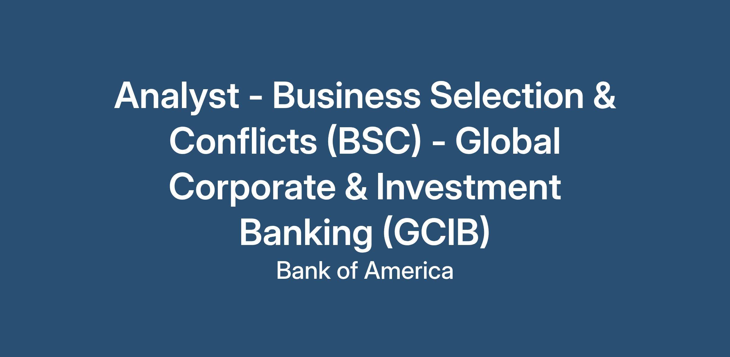 The Business Selection & Conflicts Group (BSC) is the first point of contact within Investment Banking on potential new business opportunities as well as queries regarding ongoing transactions. BSC clears all new potential business mandates to confirm potential conflicts of interest are anticipated, identified, and managed. BSC also drives decision making on business selection issues to ensure the firm is committing to the most attractive opportunities.