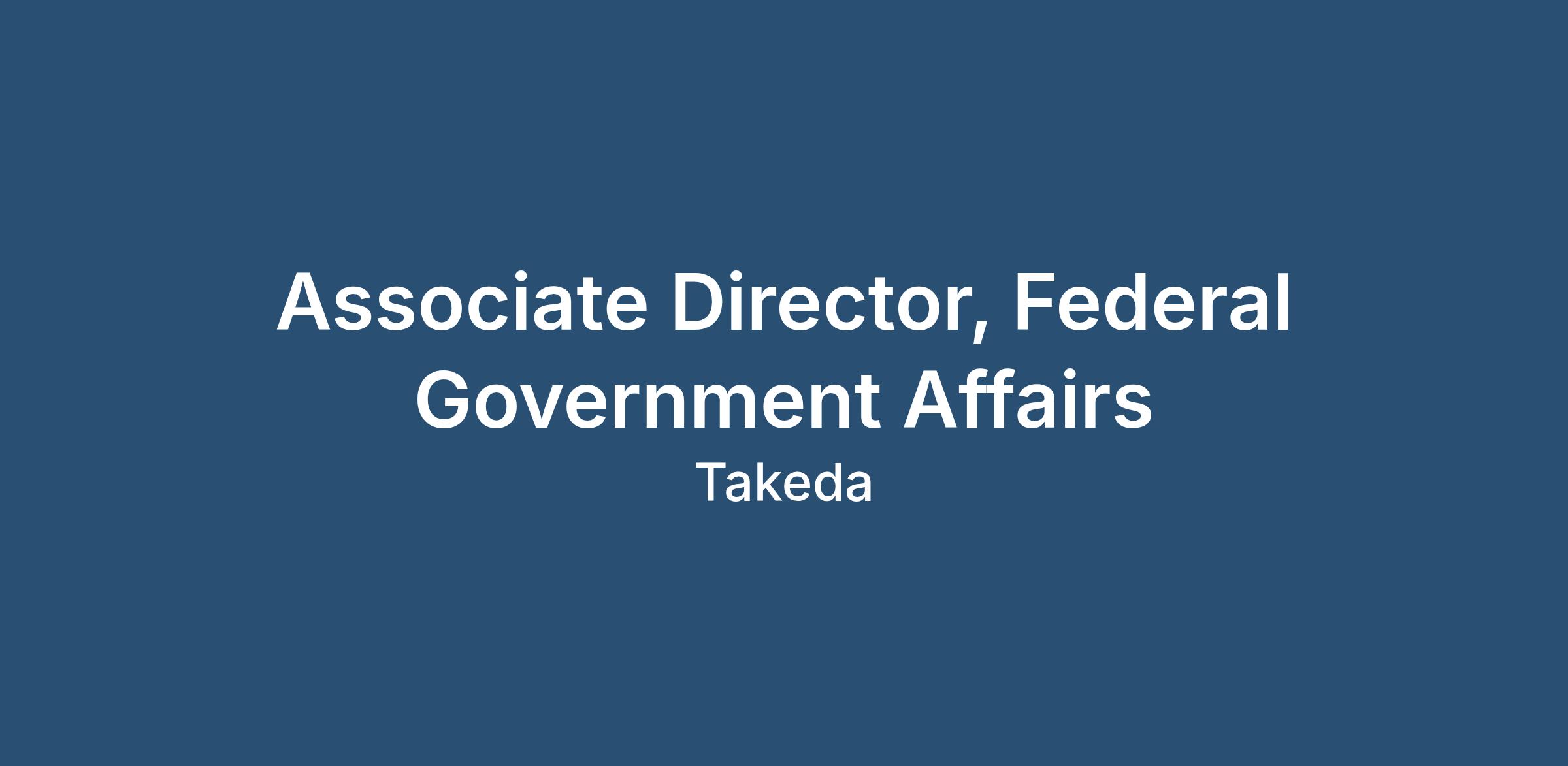 The Associate Director, Federal Government Affairs (FGA) will contribute to Takeda’s advocacy efforts and help execute strategies aligned with legislative and executive branch priorities. As a key internal expert on the external environment, this role will provide strategic insights identifying threats and opportunities related to commercial, clinical, and operational practices.