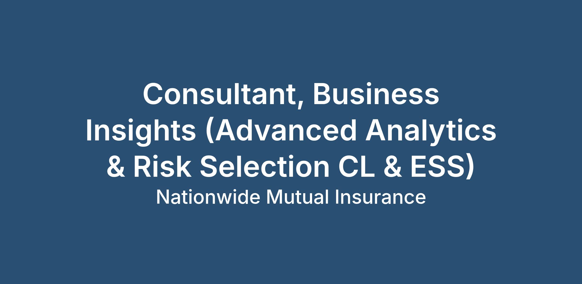 Nationwide pays on a geographic-specific salary structure and placement within the actual starting salary range for this position will be determined by a number of factors including the skills, education, training, credentials and experience of the candidate; the scope, complexity and location of the role as well as the cost of labor in the market; and other conditions of employment. If a Sales job, Sales Incentives, based on performance goals are possible in addition to this range. Note on Compensation for Part-Time Roles: Please be aware that the salary ranges listed below reflect full-time compensation. Actual compensation may be prorated based on the number of hours worked relative to a full-time schedule.The national salary range for Consultant, Business Insights : $108,000.00-$200,000.00The expected starting salary range for Consultant, Business Insights : $108,000.00 - $162,000.00