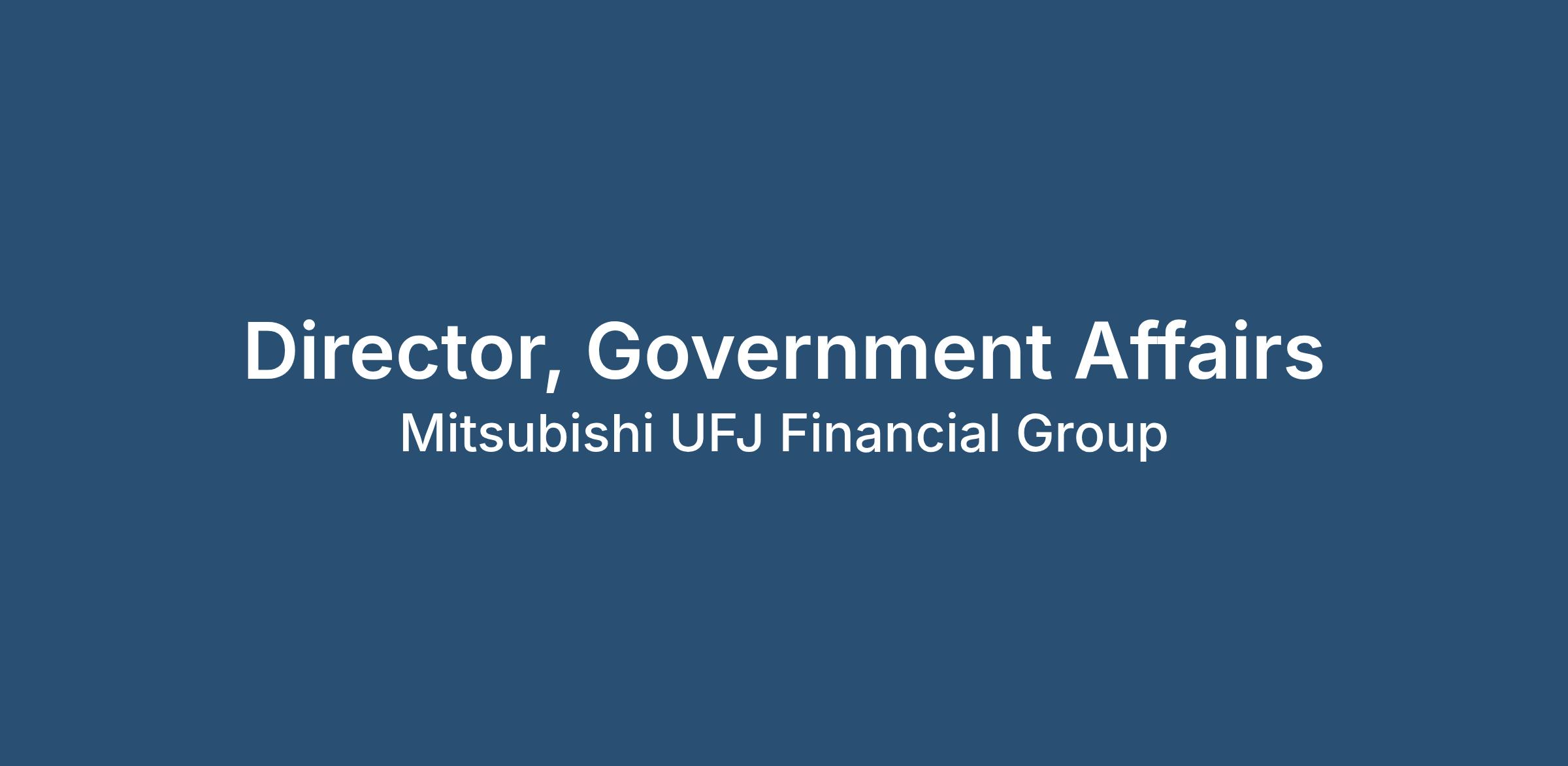 The Director, U.S. Government Affairs, will serve as a senior member of MUFG Americas’ Government & External Affairs function, supporting the development and execution of the firm’s federal policy, regulatory engagement, and advocacy strategy in Washington, D.C. The role is responsible for leading engagement across defined policy areas and stakeholder groups, including Congress, the Executive Branch, and federal regulatory agencies. The Director will translate legislative and regulatory developments into actionable insights for senior leadership and business lines, while advancing MUFG’s policy priorities through coordinated advocacy and relationship management. This role operates in close coordination with internal stakeholders and external partners to ensure MUFG’s perspectives are reflected in key policy discussions. The position requires strong knowledge of legislative and regulatory processes, exceptional analytical and communication skills, and the ability to distill complex developments into clear, decision-useful insights.