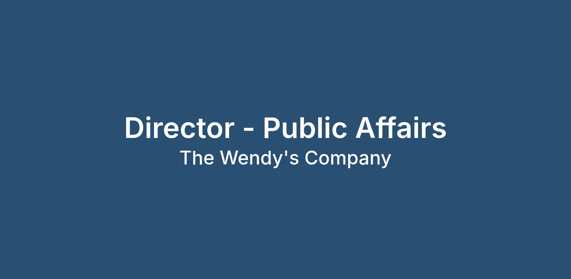 The Director of Public Affairs serves as the leader of global government affairs, public affairs/policy, legislative, regulatory and political matters on behalf of the Company and its franchise system. The person in this role will recommend, direct and oversee strategies, programs, communications and actions on local, state, federal and international levels. The Director will lead Wendy’s national franchisee grassroots program and collaborate across departments, external organizations and public affairs agencies/consultants to build influence and achieve the system’s public policy goals. This role is responsible for Wendy’s Political Action Committee and leverages internal and/or external resources to manage membership, lead engagement within the System and externally and all aspects of PAC compliance. The Director leads and/or works with others within the organization on Wendy’s external affairs involvement with trade associations, social service and philanthropic organizations that represent the industry on key issues and help build the brand’s public profile.