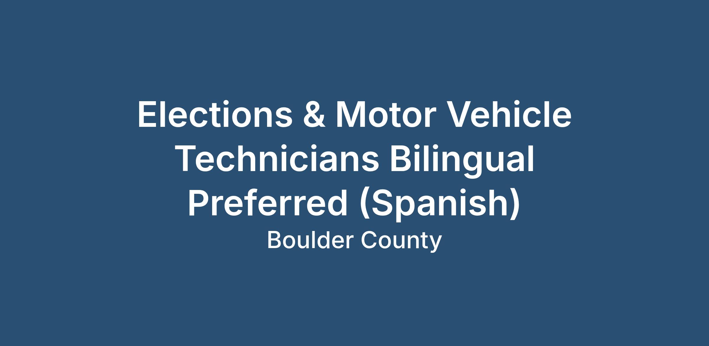 Boulder County Clerk and Recorders Office is seeking to hire 2 (two) Elections & Motor Vehicle Technicians Bilingual Preferred (Spanish). The Boulder County Clerk and Recorder's Office is currently seeking two Elections & Motor Vehicle Technicians to join our team. This hands-on role supports the needs of both divisions of the office by creating a positive collaborative relationship with the public through executing voter services and motor vehicle transactions and interactions with the public while complying with State rules and laws.