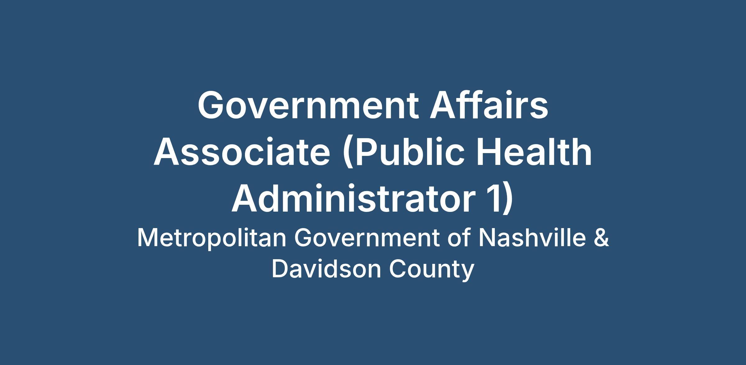 The Metro Nashville Public Health Department (MPHD) is seeking a Public Health Administrator 1 to serve as a Government Affairs Associate. This role is responsible for monitoring city, state and federal level legislative activity, conducting policy research, engaging with local elected officials and stakeholders, and coordinating advocacy strategies. The Associate plays a key role in ensuring the organization maintains strong relationships with the Metro Council, the Mayor’s Office legislative affairs team and other key policy stakeholders..