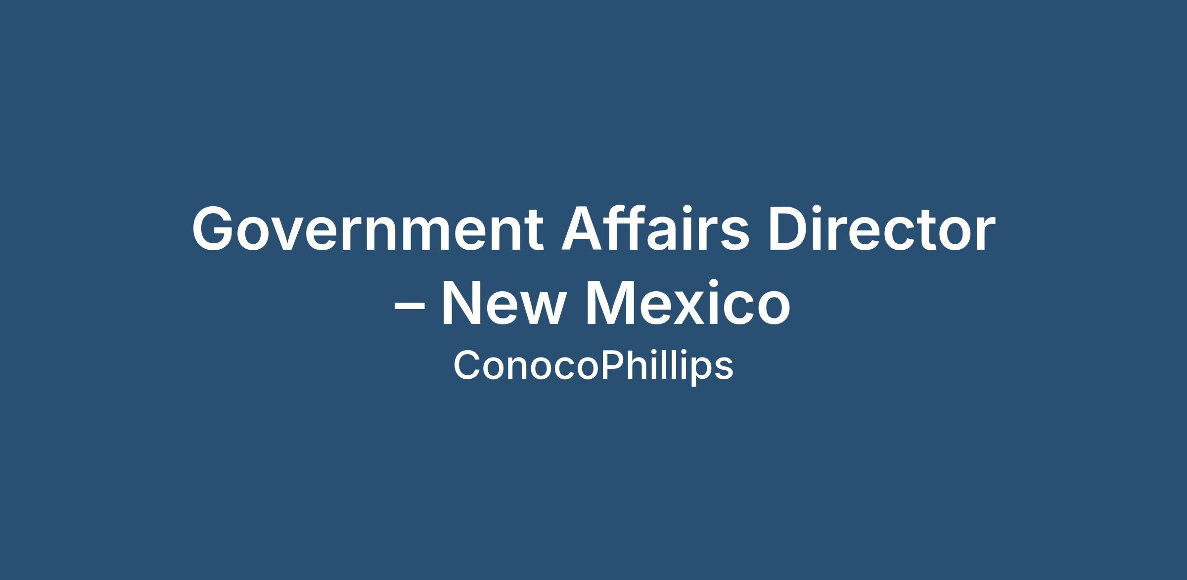 The Government Affairs Director plays a key role in advancing ConocoPhillips’ ability to operate responsibly and successfully in New Mexico. This position is based in Santa Fe, New Mexico and serves as a trusted partner to state and local leaders, community stakeholders, and internal teams to shape public policy, build understanding of our operations, and strengthen ConocoPhillips’ reputation as a safe and environmentally responsible operator.