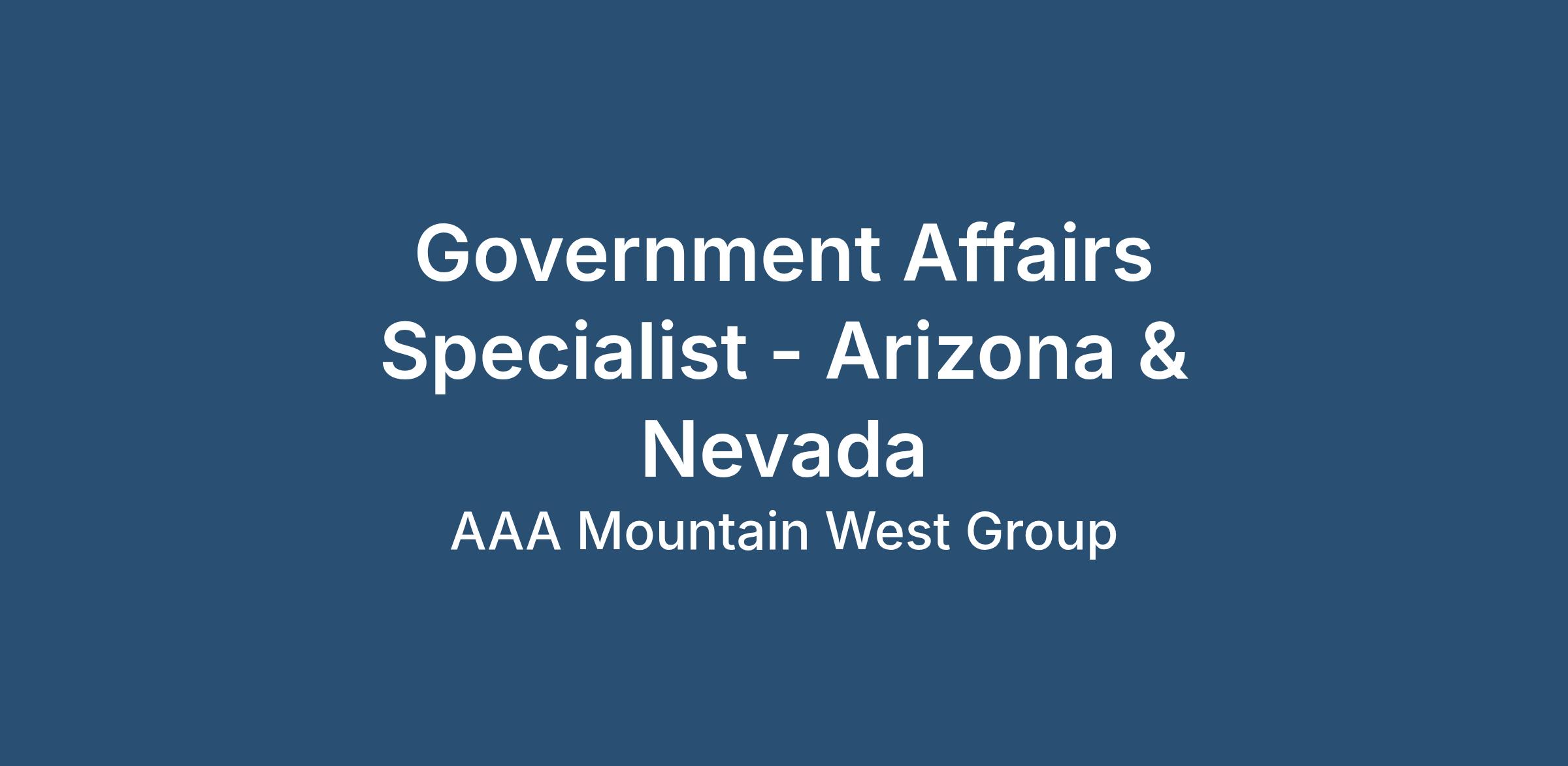 The Government Affairs Specialist will be a key player in shaping policy and advocating for the interests of the AAA Mountain West Group (MWG). AAA MWG serves over 6.7 million Members in Alaska, Arizona, Northern California, Nevada, Montana, Utah and Wyoming. This role will support advancing MWG’s public policy agenda in Arizona and Nevada. As the government affairs contact for this region, you will help develop and implement advocacy strategies, effectively build relationships with government officials, and serve as a safety champion on critical issues such as road safety, emerging vehicle technologies, and smart mobility.