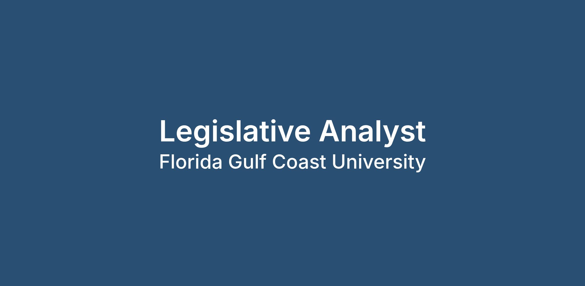The Legislative Analyst supports Florida Gulf Coast University’s (FGCU) Office of Government Relations by monitoring, analyzing, and reporting on state legislative and executive activities that impact the university and the State University System (SUS). This position plays a key role in the university’s legislative strategy by tracking proposed legislation, budget actions, and policy developments; preparing detailed briefings and written reports; and supporting advocacy efforts. The Legislative Analyst assists in coordinating legislative outreach, managing office operations related to legislative affairs, and supporting the execution of special projects and events. The role requires strong knowledge of Florida legislative processes, including House and Senate rules and protocols, excellent research and analytical skills, and the ability to communicate complex information clearly and effectively to internal and external stakeholders. This position works under the direction of the Director of Government Relations and collaborates closely with other university departments and external partners to support FGCU’s strategic legislative goals.