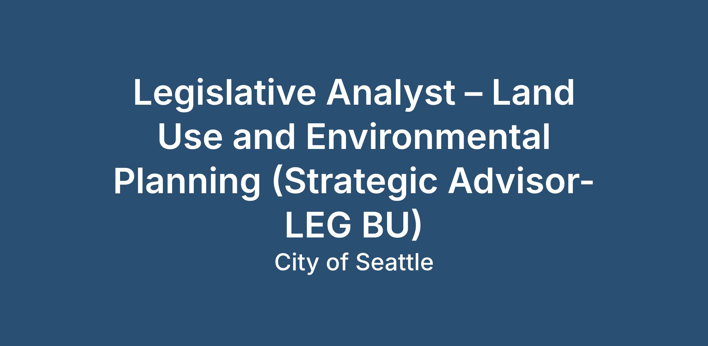The Legislative Department is seeking a land use or environmental planning and policy professional to join the City Council’s Central Staff team as a Land Use and Environmental Planning Legislative Analyst (position classification: Strategic Advisor-LEG BU).