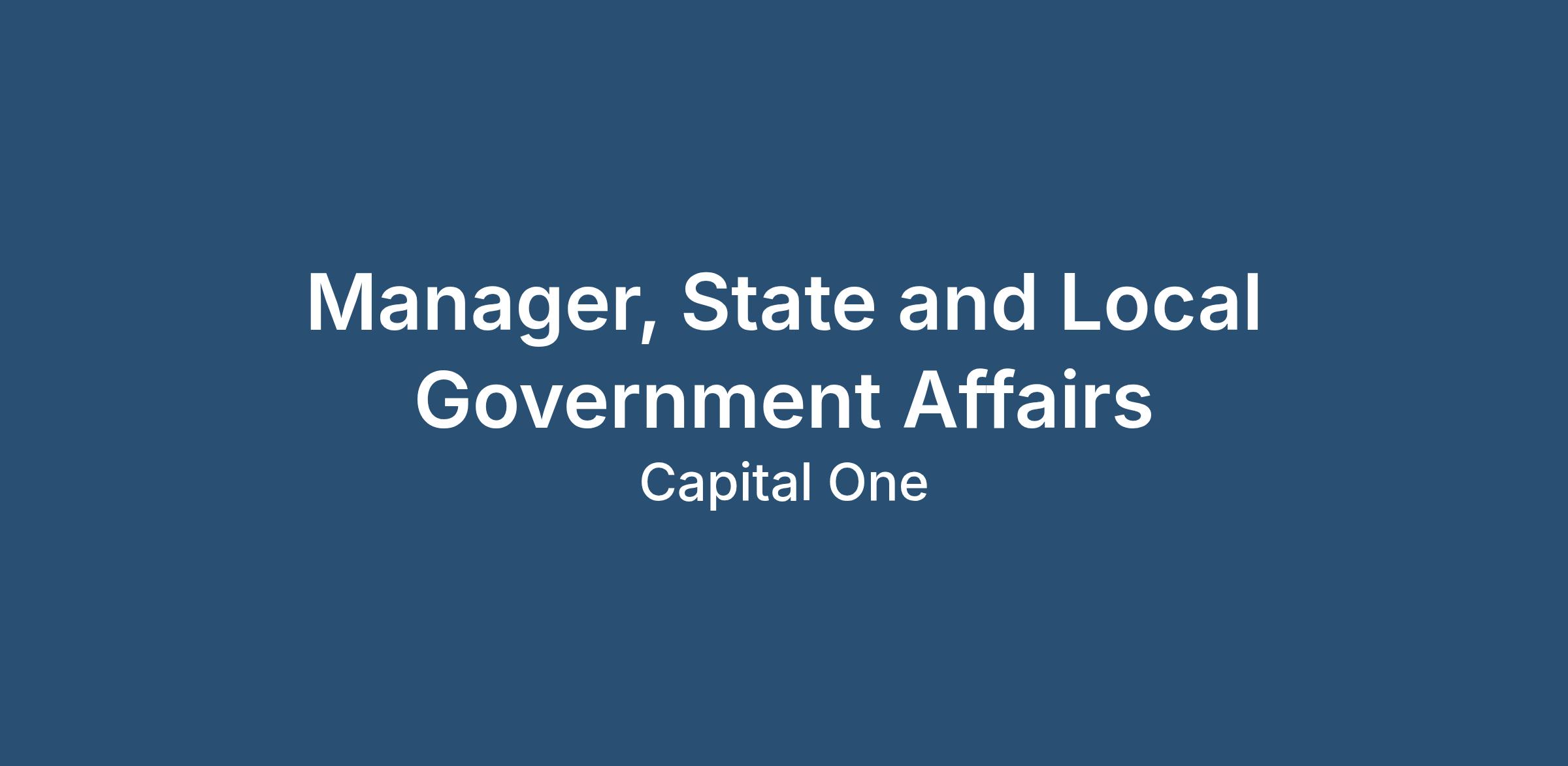 The Global Policy Affairs Group (GPAG) is Capital One’s voice in the legislative and political processes. GPAG manages Capital One’s relationship with elected officials at the local, state, and federal levels and participates in the policy making process. The team provides support to all of Capital One’s lines of business and staff groups in our markets. Capital One is seeking a talented Manager, State & Local Government Affairs to lead our state and local engagement strategy in several key jurisdictions, manage our relationship with external organizations, and internal partners.