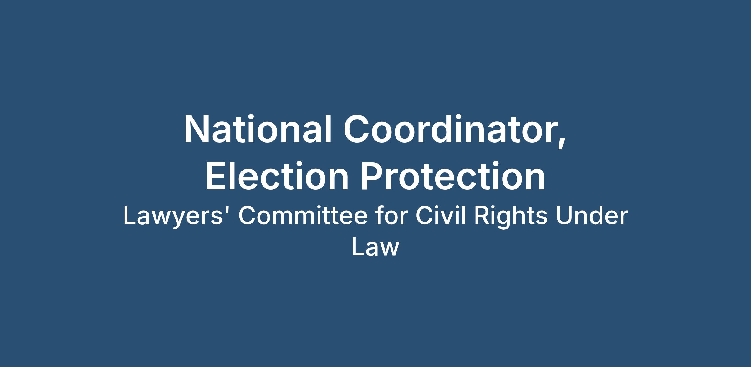 About the Role: The National Coordinator of Election Protection will maintain relationships, coordinate efforts with state and local partners, recruit and deploy legal and grassroots field volunteers, oversee the 866-OUR-VOTE hotline, and manage various call centers. Additionally, this position will craft tools and materials for grassroots and coalition partners, develop outreach materials, and represent the Lawyers’ Committee at meetings and events as required.