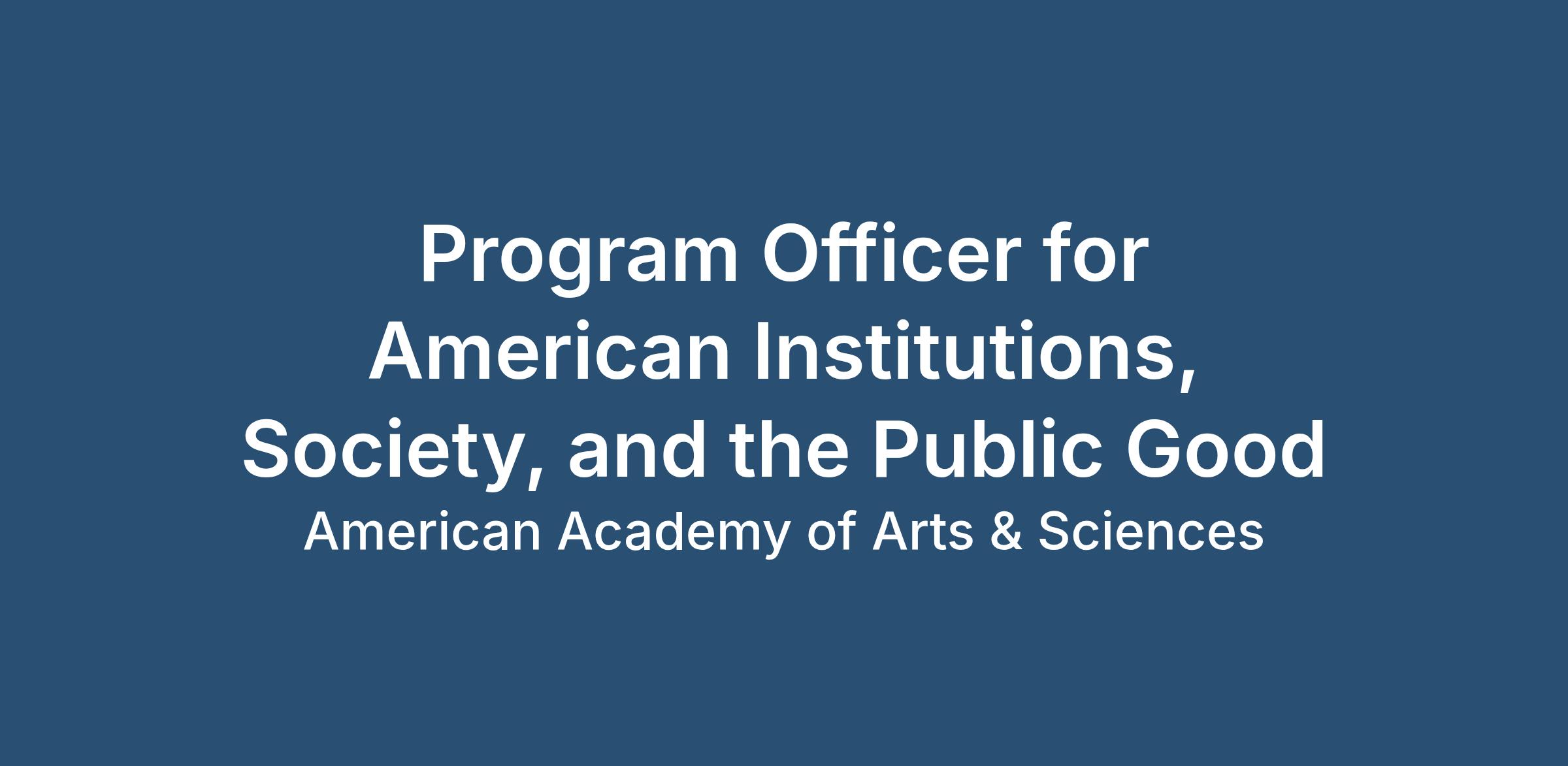 The Program Officer is responsible for research and writing, project management, policy development and analysis, and other administrative tasks related to the Academy’s work in the program area of American Institutions, Society and the Public Good. Building on the work of the Our Common Purpose project and the Commission on Reimagining the Economy, the Program Officer will play a key role in developing new, non-partisan, cross-ideological project(s) focused on the American economy and democracy, and in supporting new work exploring local solutions to national problems.