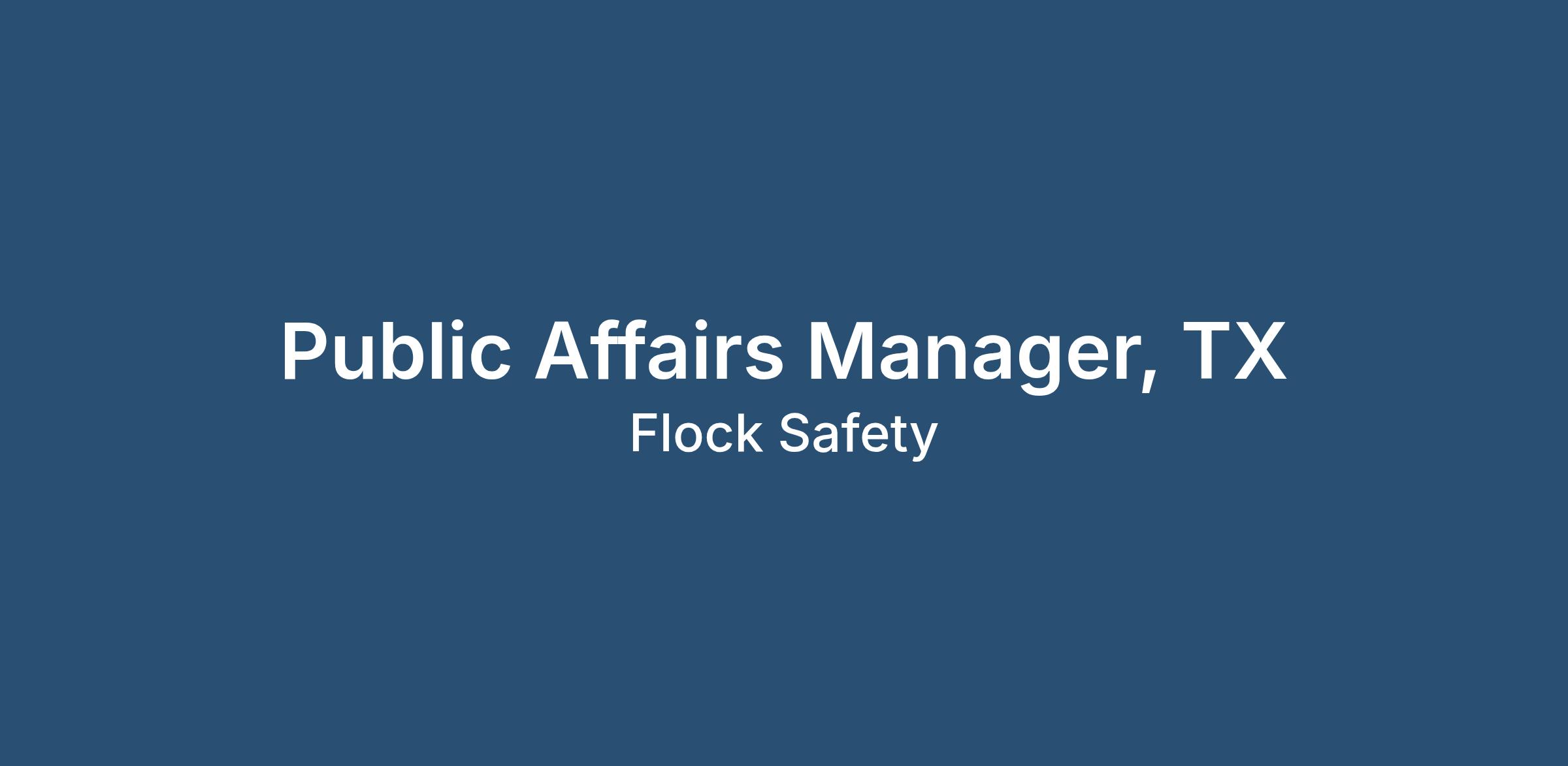 We are seeking a Public Affairs Manager to play a critical role in engaging with external stakeholders to enhance public safety in our communities. Reporting to the Director of Public Affairs, this role will focus on collaborating with cross-functional partners to engage with local elected officials, grassroots/grasstops organizations, and community leaders. You will represent Flock Safety externally, including regularly speaking at city council meetings, help build credibility across a variety of stakeholder audiences, develop meaningful partnerships, and elevate the voices of our customers and those who benefit from our tools to help advance our strategic policy objectives.