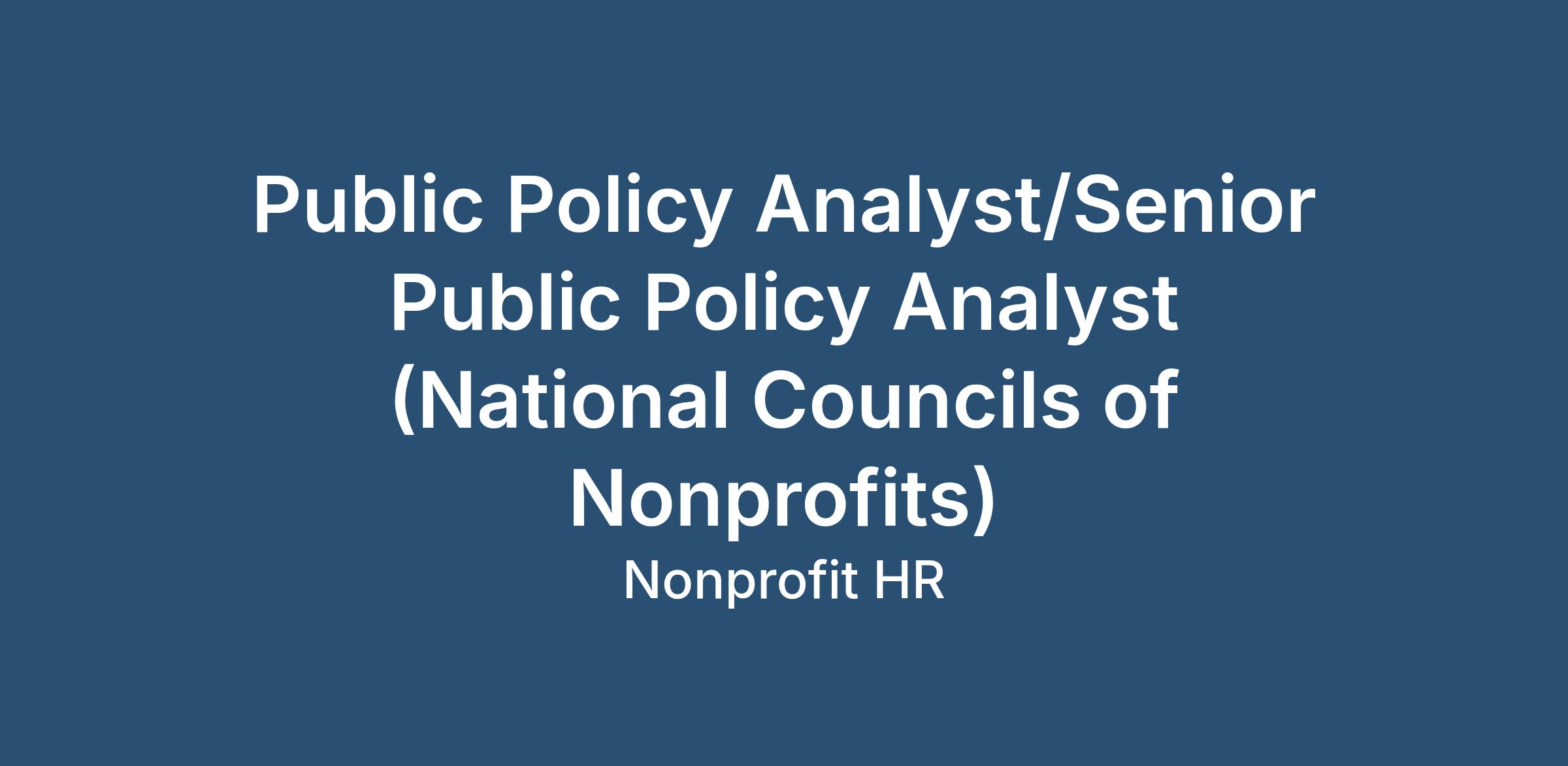 Candidates must reside in the DC, Maryland, or Virginia (DMV) areaCharitable nonprofits improve our lives, add vitality to our communities, contribute to our local and national economies, and enhance the health of our democracy. The National Council of Nonprofits (NCN) is the largest network of nonprofits in North America. We connect, champion, and inform organizations across the country to score big wins for nonprofits and the communities they serve. Working with our core network and other collaborative partners, we get things done. We are seeking a dynamic, creative, and detail-oriented Public Policy Analyst or Senior Public Policy Analyst to join our collective efforts to create a connected and powerful nonprofit community that has what it needs to champion the public good. The Public Policy Analyst or Senior Public Policy Analyst promotes the policy objectives of the National Council of Nonprofits, as outlined in the organization’s Public Policy Agenda, and our network of state and regional nonprofit associations through a combination of policy research and analysis, advocacy, action, network support, and communications activities.We Are:- The trusted go-to experts for and about nonprofits, providing practical information that nonprofits use to operate more effectively, efficiently, and ethically, bringing attention to issues affecting the work of nonprofits, and illuminating how they contribute to a strong culture and a healthy civil society.