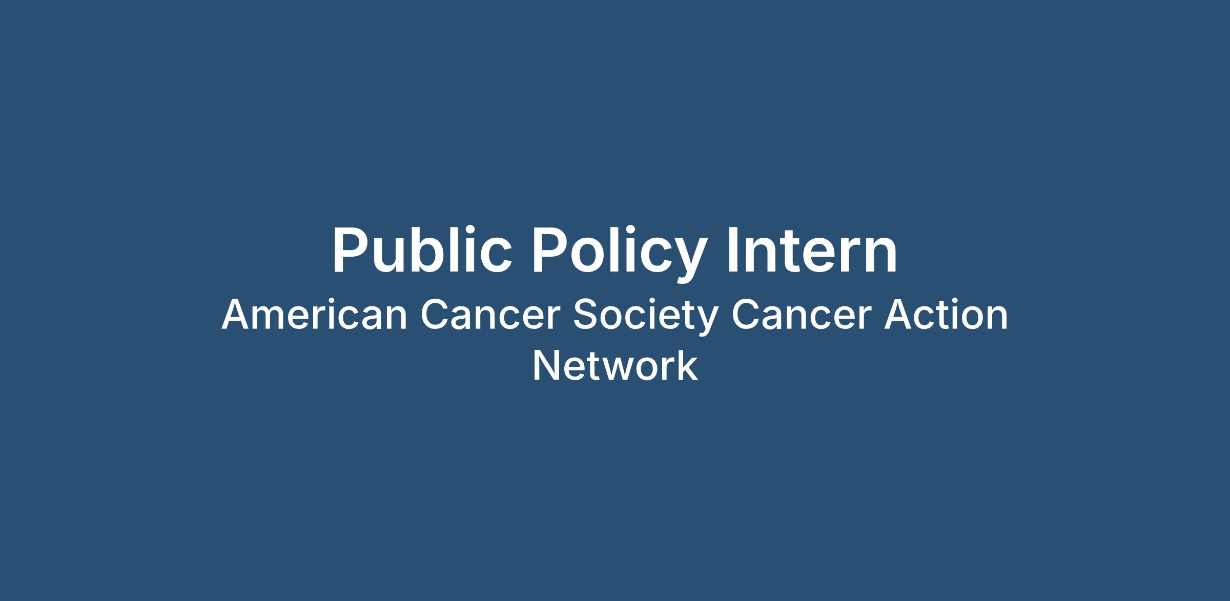 This is a remote, home-based internship. Full time students from all US geographies will be considered. Our 2026 Summer internship program is an 8-week Paid Internship that runs from June 1st – July 24th, at 37.5 hours weekly. The program will join interns across the country who are supporting different department focuses on American Cancer Society and ACS's Cancer Action Network. 85% of the time will be in working within the given department, with the Intern's manager, their mentor, and the team. The other 15% will be with a cohort of other interns around American Cancer Society and ACS CAN.The ACS CAN Policy team is hiring an intern for the summer. The Public Policy Internship is an exciting opportunity to work with the American Cancer Society Cancer Action Network – the advocacy affiliate of the American Cancer Society. Through its advocacy work at the local, state, and federal level, ACS CAN influences evidence-based public policy change, as well as legislative and regulatory solutions to reduce the cancer burden.