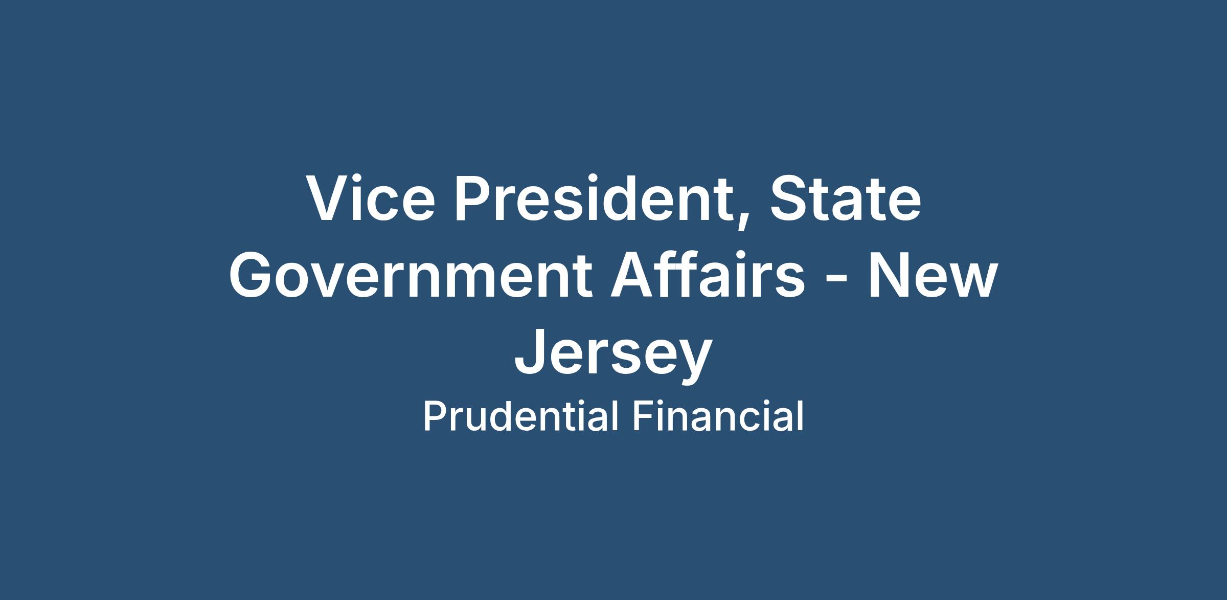 Marketing & Communications - CommunicationsThe Vice President, State Government Affairs – New Jersey position has primary accountability for legislative and executive branch engagement in New Jersey. Based in Trenton, this role serves as Prudential’s principal representative before New Jersey policymakers and senior administration officials and advances the company’s public policy priorities through direct advocacy, strategic coalition engagement, and close coordination with internal business and functional partners. The role is recognized as an expert in state public policy and political engagement and is accountable for the day-to-day execution and results of the New Jersey government affairs function.